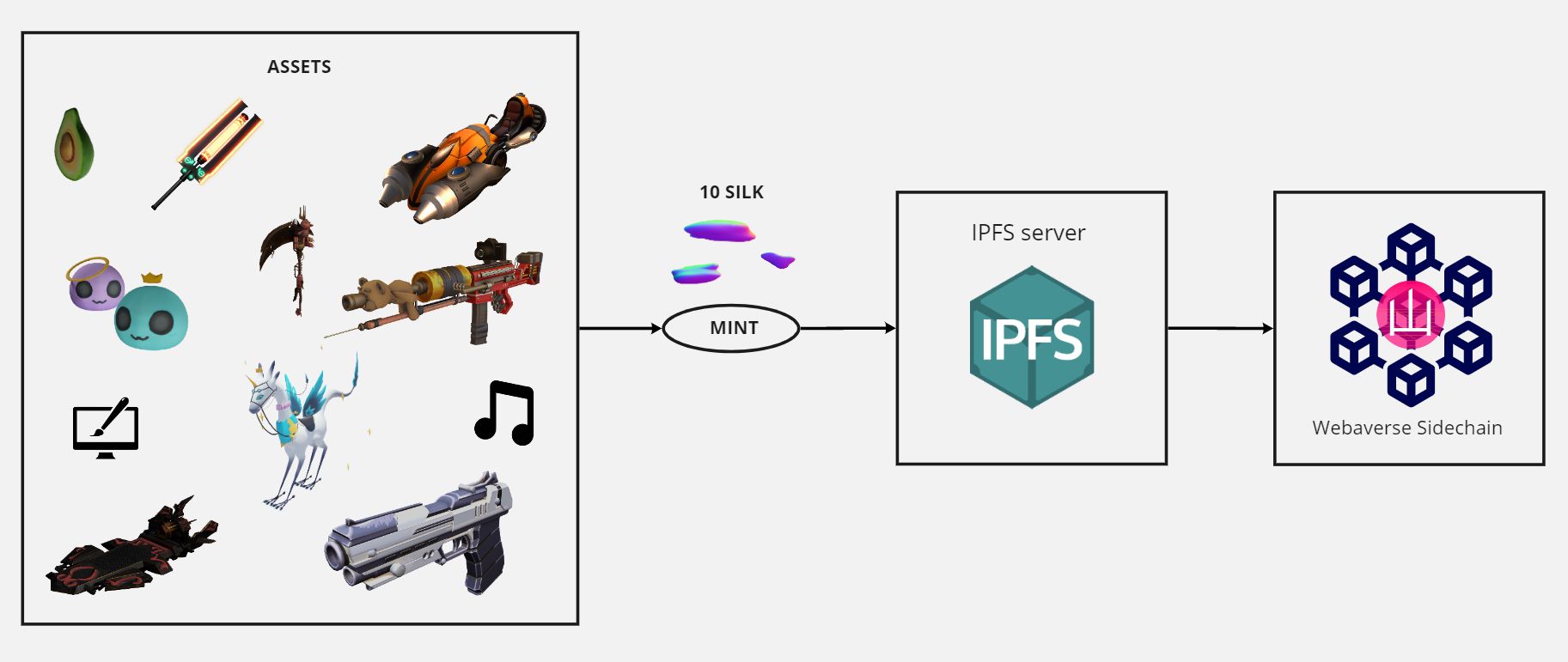 You can mint NFTs simply by dragging and dropping a file into the Webaverse mint page or Discord. There's currently a 10 SILK fee for minting. If you want a step-by-step guide on how mint NFTs, check out this guide.